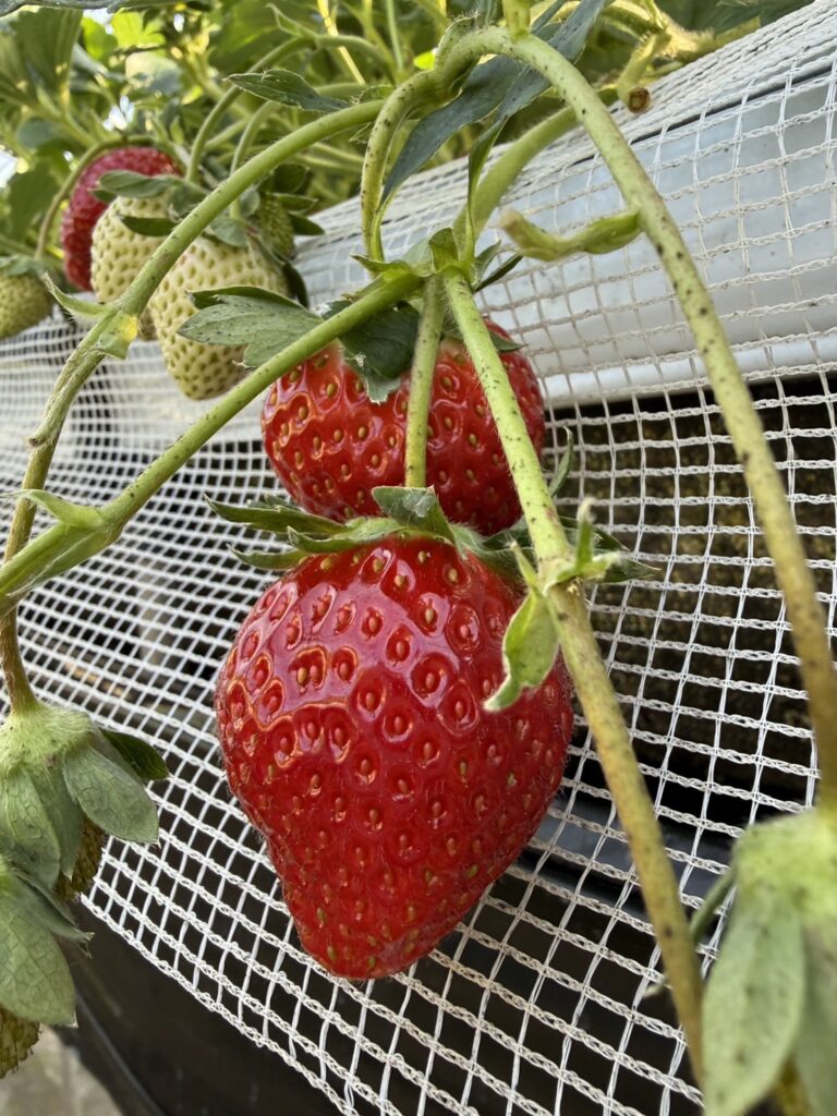 Inside the greenhouse, rows of bright red strawberries were waiting.